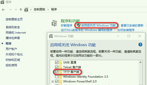打开 Windows 功能 -> TFTP客户端。