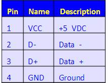 红(Vcc)),白(D-),绿(D+),黑(GND)